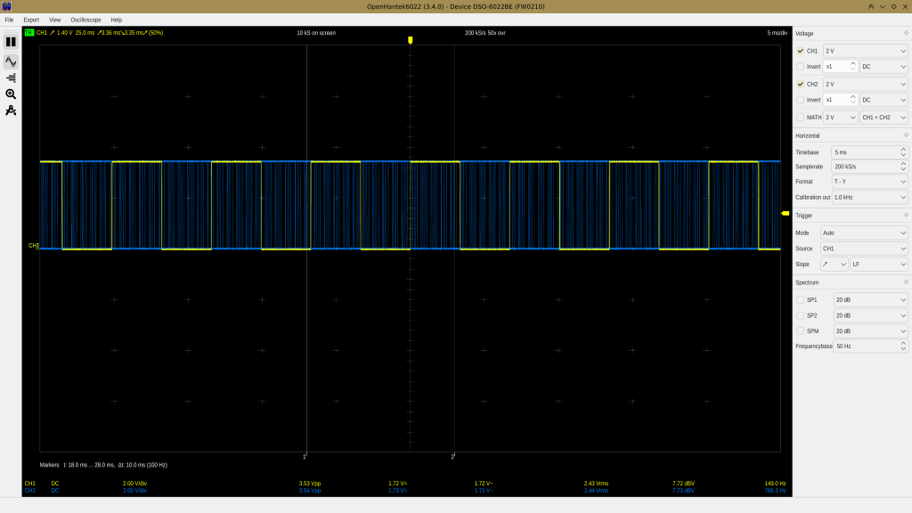 Let’s confirm this. After a bit of digging I found my cheap chinese USB-oscilloscope and hooked it up to the tachometer signals from the fans: