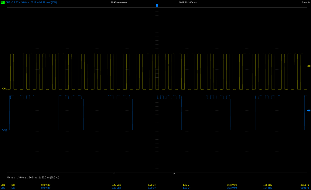 Yellow is the output from my code, Blue the input from the fans; you can see how the signals happily interfere with each other